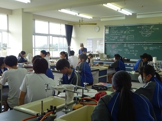 3年:理科 「中和」の説明。理科室は3階にあることから気温が教室よりも高め。風が入りにくい位置にあることからも熱気がこもりがちです。そんな中での授業ですが、先生の説明をよく聞いていました。