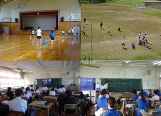 <授業風景> 1年:英語、体育、2年:体育、3年:英語 体育はソフトボールを行っています。雨の日は体育館です。T台を使っての打撃練習。キャッチボールの後は守備練習。 晴れの日は、グラウンドで思いっきりゲームを楽しみます。大きな歓声が響いていました。