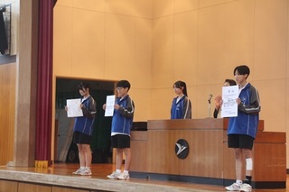 <新人大会報告会・表彰> 最後の新人大会となった10月2日。参加した各部の部長から報告がありました。接戦の末、惜しくも涙をのんだ思い。自己ベストが更新された喜び。これからの活動に活かせるよう期待しています。