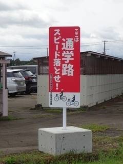 <看板設置> 学校だよりでもお知らせしましたが、事故防止看板を後援会、雄志中学区青少年育成会様よりご協力いただき設置しました。 コンクリートの土台は90センチ四方、重さ1トンにもなります。郵便局の方から学校前を通り過ぎるところのカーブはちょうど自転車や送迎の車が出てきて、接触事故が起きやすいところです。 注意喚起の赤い看板、ぜひ気を付けていただきたいです。