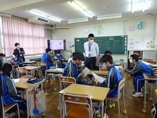 三連休明け、風邪症状による欠席が非常に多く、教室は空いている席が目立っていました。電話が鳴るたび、インフルエンザの報告ではないかと、心配しています。<Students Enjoy English Project訪問> 上越教育事務所から英語授業の参観を受けました。授業では、how tow を使って相談内容へのアドバイスを行う2年生の授業でした。 来年3年生の4月の実施される全国学力状況調査では、国語・数学のほかに英語が実施されます。英語に親しむ時間を増やしていきましょう。