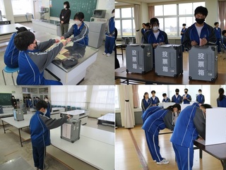 <投票> 昼休みに学年ごとに行われた投票。選挙管理委員会のスムーズな動きによって、時間通りに終了。立会演説会の準備や進行もてきぱきと行われました。ありがとうございました。 選挙結果は今朝生徒玄関前に掲示されました。新生徒会長、副会長の3名の皆さん、よろしくお願いします。