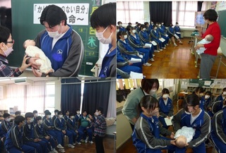 <3年 命きずなを考える講座> 山田保健師、清水保健師のお二人から講師を務めていただきました。男女に分かれてそれぞれの体の仕組み、妊娠・出産、命をはぐくむために今とこれからの自分の心と体を大切にしていくお話でした。 赤ちゃん人形をだっこするとみんな笑顔になっていました。妊婦ベルトを付けた男子は「重たい!」と実感できたようです。 明日も気温が下がります。温かくして過ごしましょう。車で送迎してもらっていても、玄関前で車を待つ間は寒いです。冬用の防寒着を着たり、マフラーや手袋で防寒しましょう。