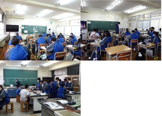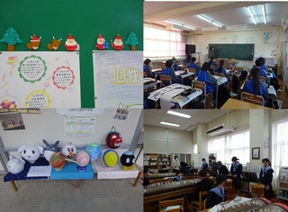 1年:美術、国語、音楽 1年生の美術作品が校長室前廊下に展示されました。風船に紙を張って、オブジェをつくっています。 国語は、書初めが始まりました。楷書から草書、行書への筆遣いについて説明があり、実際に書いていきます。 1年生の学年スローガンにはサンタクロースが登場しました。 年末のイベントを楽しみにしている生徒がたくさんいるようです。