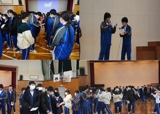 委員会ごとに先輩へ感謝のメッセージを手渡しました。3年生からは、ラップによるお礼があり、会長・副会長の息の合った姿を披露。 終わった後に、何とも言えないほっこりした気持ちになりました。3年生、ありがとうございました。 皆さんの背中を見てきた1・2年生が雄志中を引き継いでいきます。
