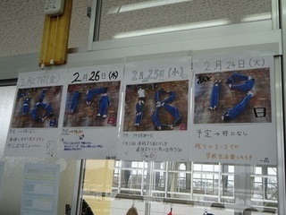 <カウントダウンカレンダー> 3年生のカウントダウンカレンダーはいよいよ1桁となりました。1年生のクラスにもあったのですが、こちらは人文字です。 寒暖の差が激しい時期が続いています。雪解けとともに、花粉の飛散も始まったようで、かゆみや鼻水などの症状が出てきています。気を付けて過ごしましょう。