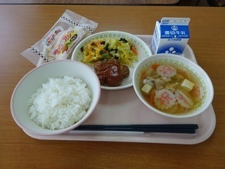 <卒業お祝い給食> ごはん 牛乳 お祝い澄まし汁 いろどりあえ 花形ハンバーグマスタードソース チョコクレープ 最近、かまぼこが進化していて文字だけでなくキャラクターのイラストもはっきりしたものが多くて、楽しみが倍増します。 今日の給食は、味にも工夫があって、ハンバーグソースにマスタードが入って深みを増していました。 チョコクレープがついて大満足でした。